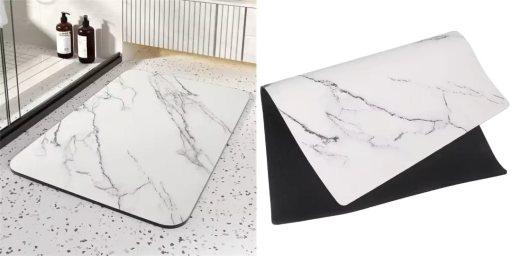 Каменните постелки за баня са направени от диатомит (известен още като диатомичен камък) — естествен минерал с изключително пореста структура. Именно тази структура позволява на материала да абсорбира водата мигновено и да изсъхне за минути, без да задържа влага в себе си.