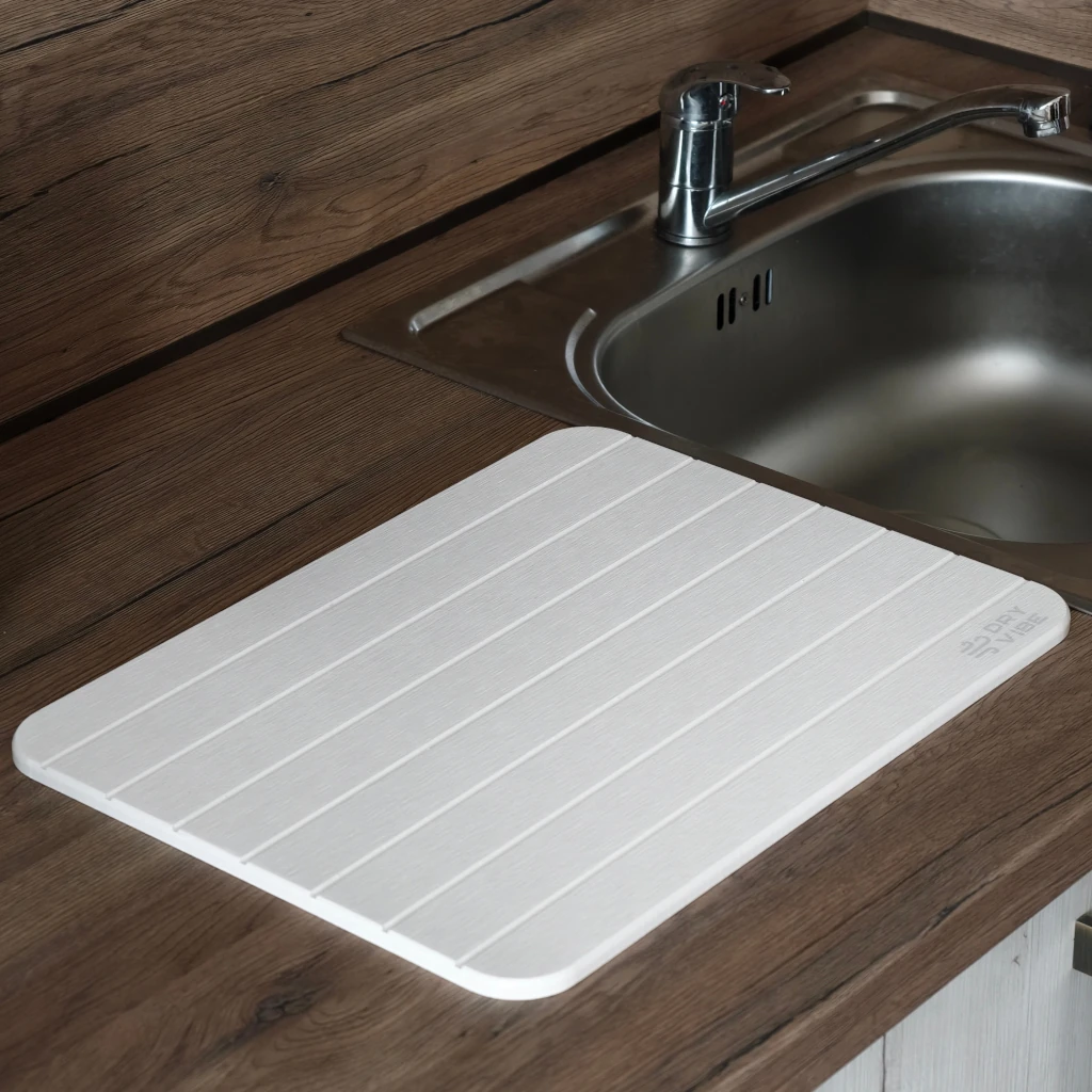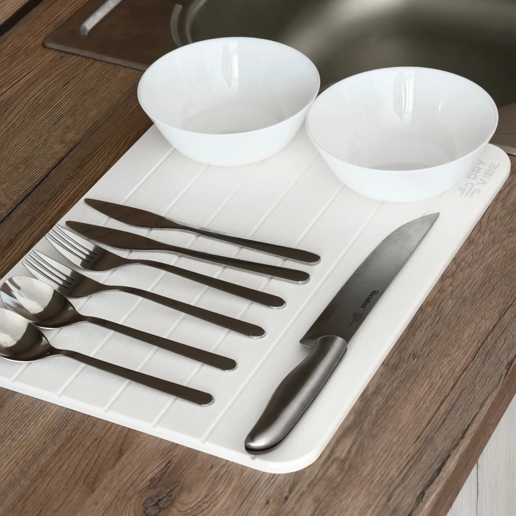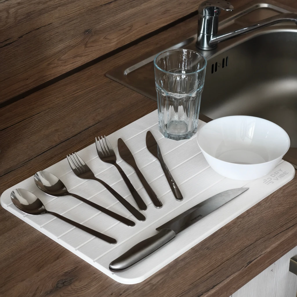 Подложките за съдове DryVibe са направени от диатомичен камък, който изсъхва изключително бързо и предодвратява развитието на бактерии и мухъл.